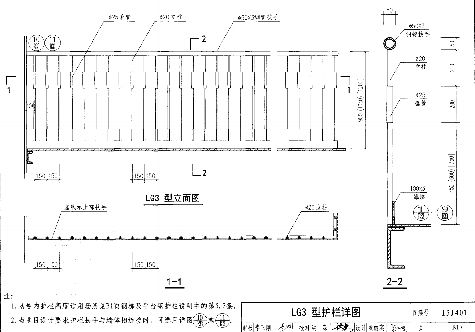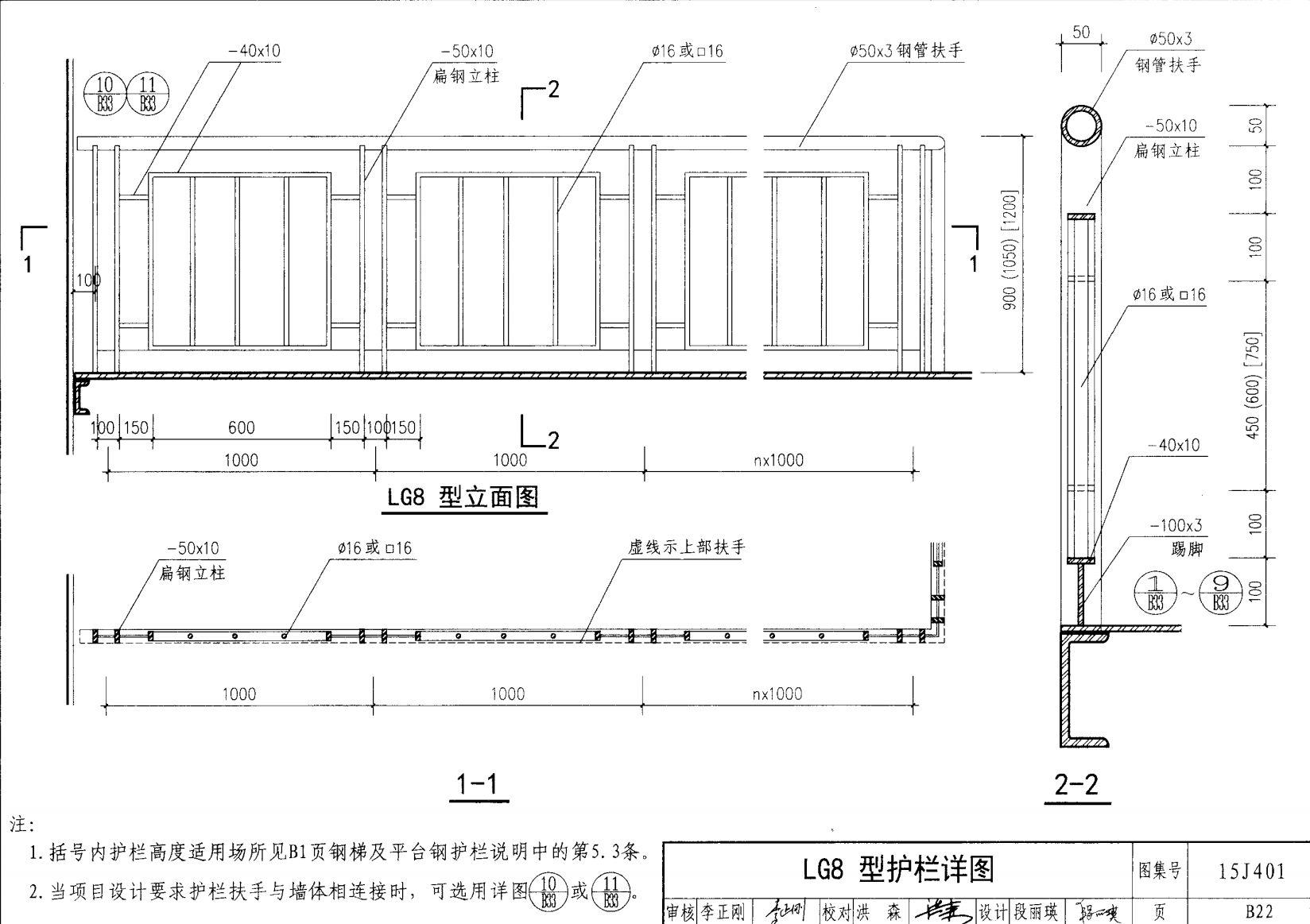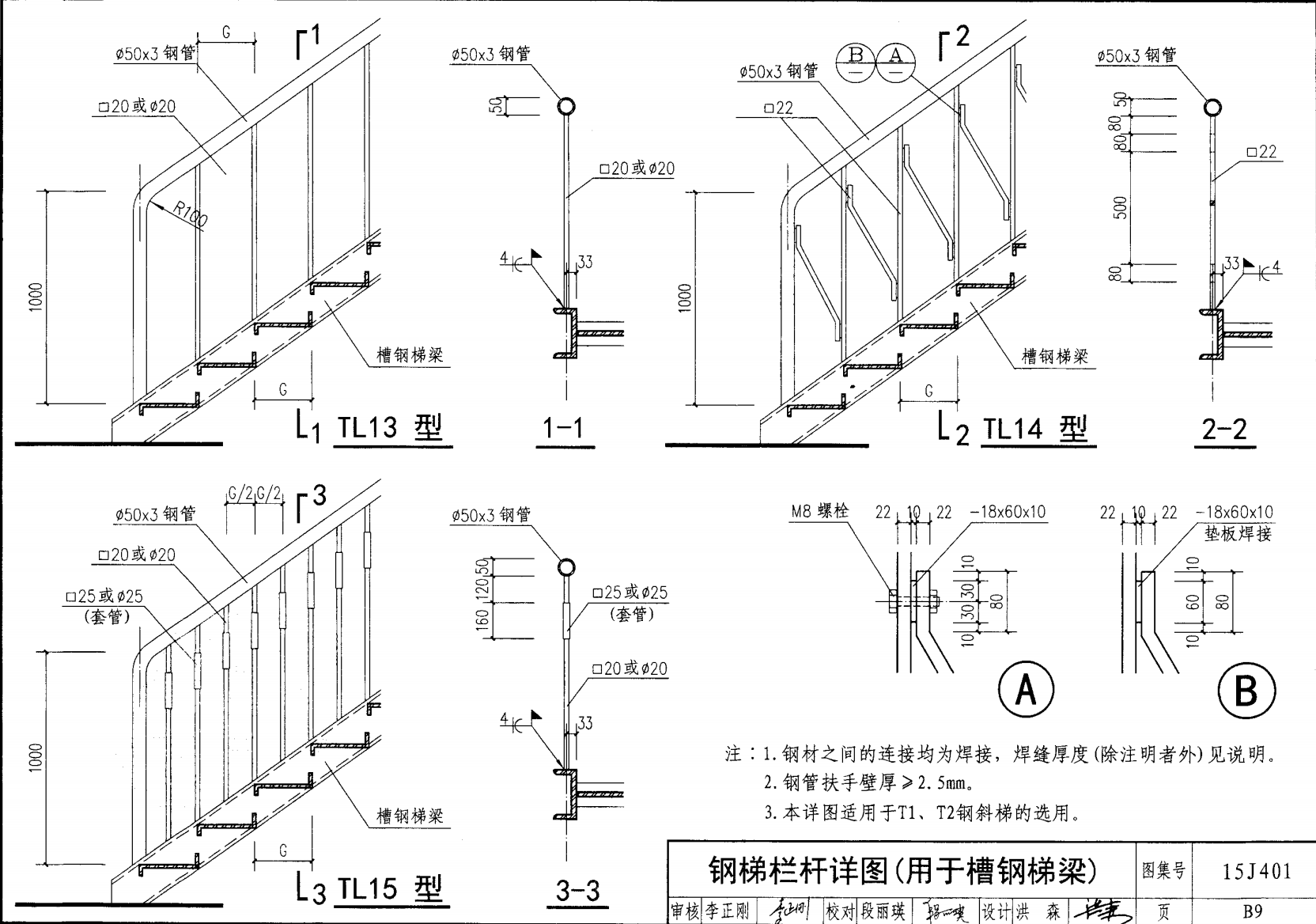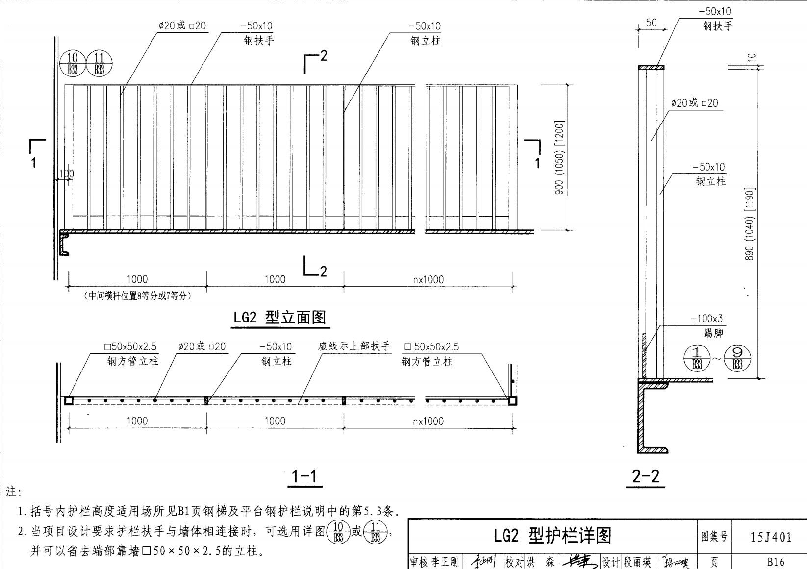 欄桿采用鋼材力學(xué)性能不低于 格證的鋼材Q235-B ,并具有碳含量合 所有欄桿均可用不銹鋼制作 欄桿的焊接要求應(yīng)符合《鋼結(jié)構(gòu)工程施工質(zhì)量驗(yàn)收規(guī)范》 GB50205-2001 證結(jié)構(gòu)設(shè)計(jì)強(qiáng)度的規(guī)定。當(dāng)焊接不便時(shí)可用螺栓連接,但應(yīng)保 鋼質(zhì)欄桿的涂裝要求可以熱鍍鋅和噴漆,噴塑 施工中如果用其他型鋼取代圖集中的立柱或減少立柱截 面尺寸,都應(yīng)按荷載規(guī)范認(rèn)真核算,以確保安全