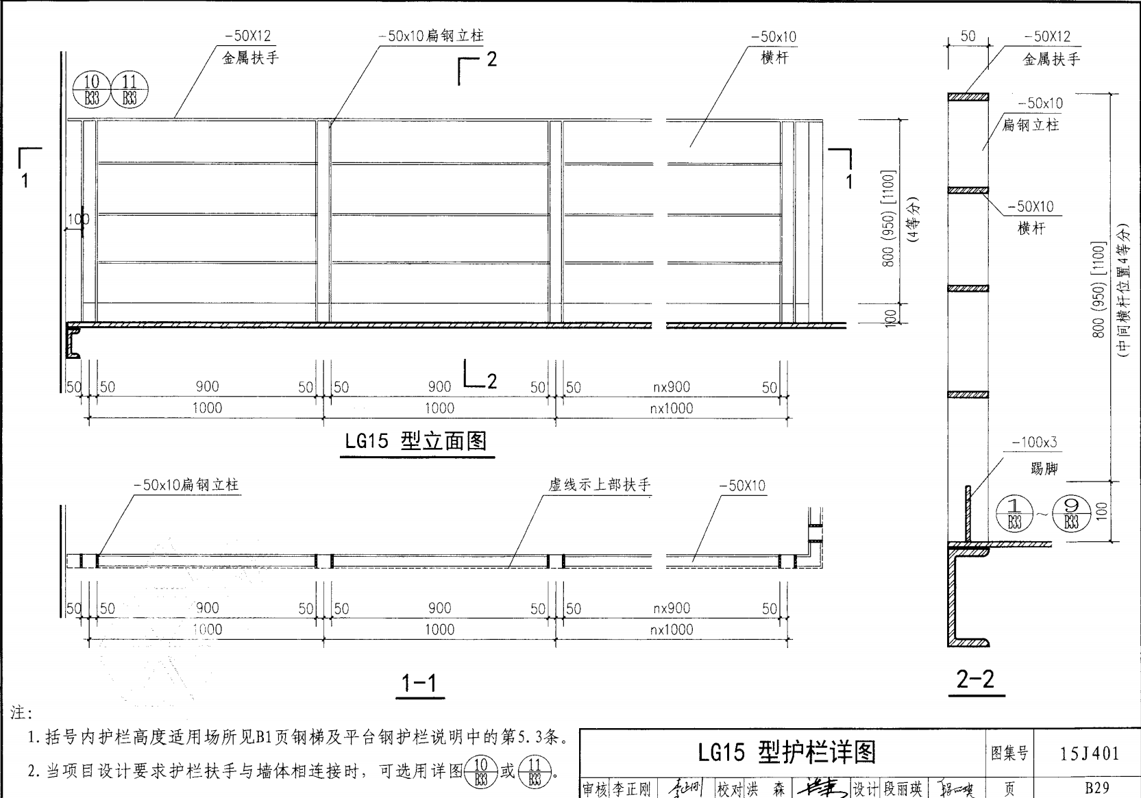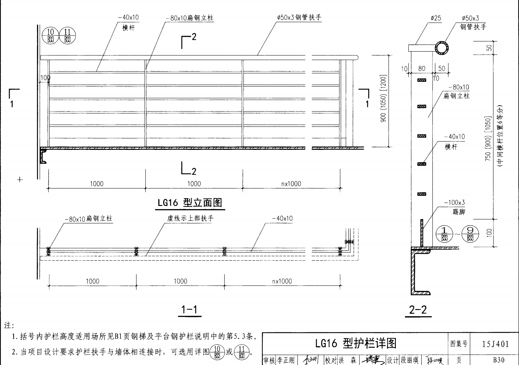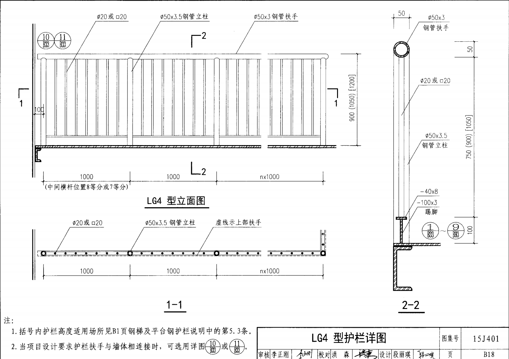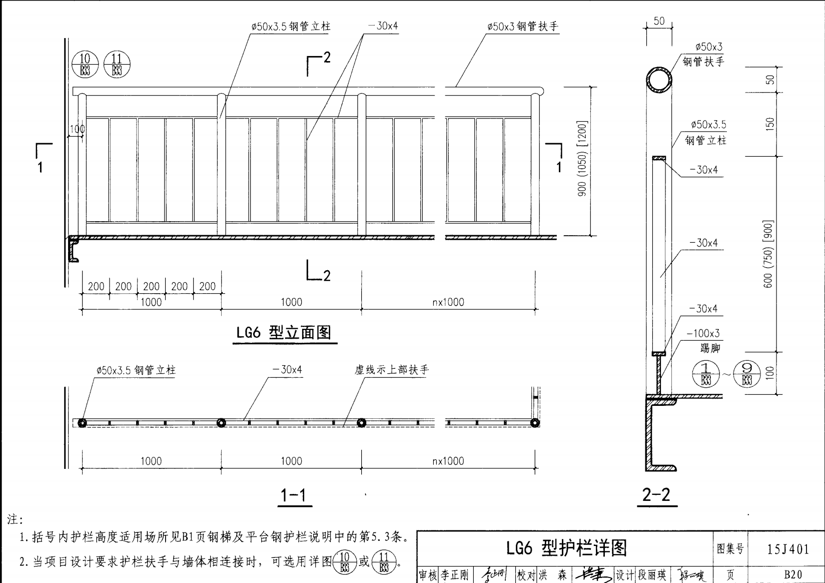 欄桿采用鋼材力學(xué)性能不低于 格證的鋼材Q235-B ,并具有碳含量合 所有欄桿均可用不銹鋼制作 欄桿的焊接要求應(yīng)符合《鋼結(jié)構(gòu)工程施工質(zhì)量驗(yàn)收規(guī)范》 GB50205-2001 證結(jié)構(gòu)設(shè)計(jì)強(qiáng)度的規(guī)定。當(dāng)焊接不便時(shí)可用螺栓連接,但應(yīng)保 鋼質(zhì)欄桿的涂裝要求可以熱鍍鋅和噴漆,噴塑 施工中如果用其他型鋼取代圖集中的立柱或減少立柱截 面尺寸,都應(yīng)按荷載規(guī)范認(rèn)真核算,以確保安全