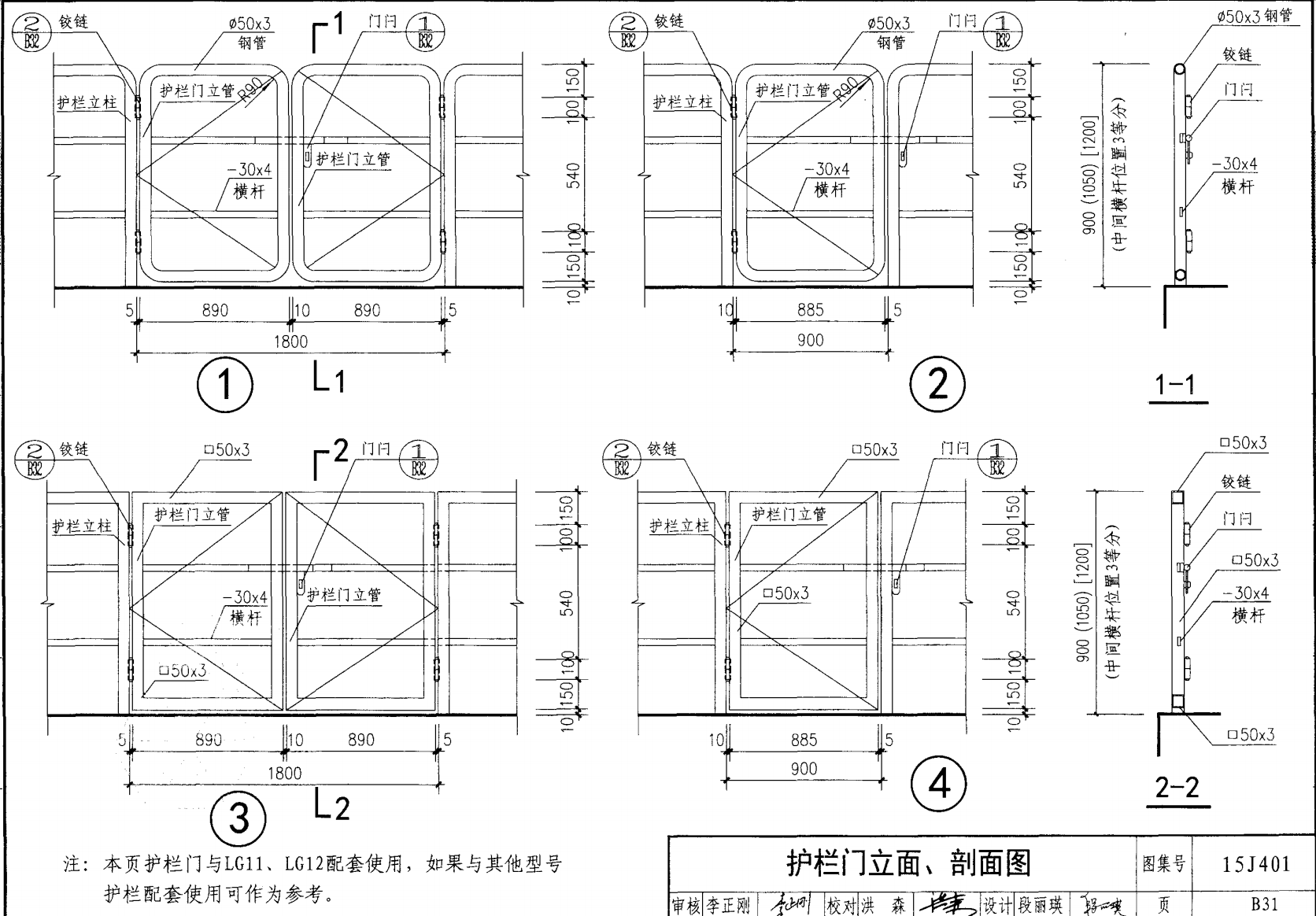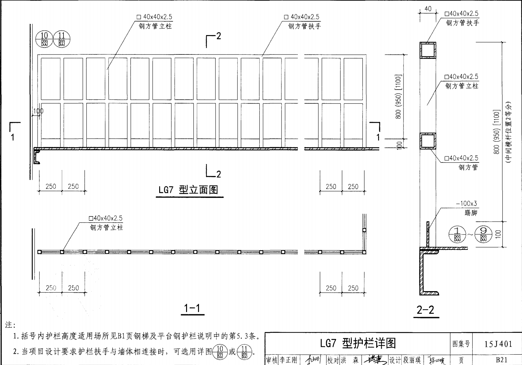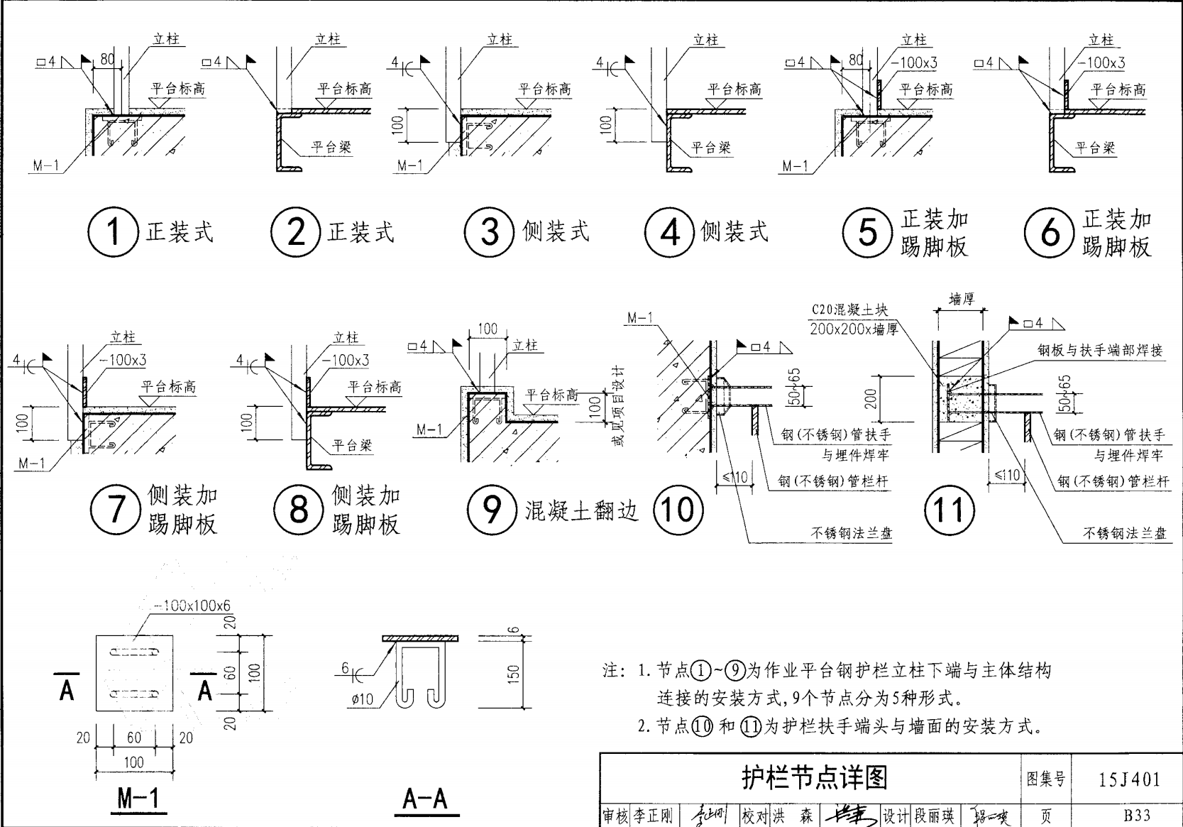 本圖集的作業(yè)平臺(tái)鋼梯欄桿分為用于銅板梯梁和槽鋼梯 梁兩大類(lèi)距下方相鄰地坪 邊緣均應(yīng)設(shè)置工業(yè)防護(hù)欄桿1. 2m 以上的作業(yè)平臺(tái)或工作面所有敞開(kāi) 作業(yè)平臺(tái)鋼護(hù)欄高度要求按客戶(hù)要求和15J401圖集標(biāo)準(zhǔn) 高作業(yè)場(chǎng)所距基準(zhǔn)面高度 900mm< 2m 時(shí),欄桿高度應(yīng)不低于 高作業(yè)場(chǎng)所距基準(zhǔn)面高度 不低于2m < 20m 時(shí),欄桿高度應(yīng) 1050mm 高作業(yè)場(chǎng)所距基準(zhǔn)面高度 1200mm20m 時(shí),欄桿高度應(yīng)不低于 在作業(yè)平臺(tái)或工作面上可能使用工具、機(jī)器部件或物品 的場(chǎng)合,應(yīng)在所有敞開(kāi)邊緣設(shè)置踢腳板或結(jié)構(gòu)板做翻邊,踢腳板的高度不應(yīng)小于lOOmm "建議采用 100 x 3mm 的鋼板 在扶手和踢腳板之間,應(yīng)設(shè)置中間欄桿,確保中間欄桿 與上下構(gòu)件間形成的空隙間距不大于500mm 本圖集提供了欄桿門(mén)的做法。欄桿門(mén)的高度和式樣都應(yīng) 與作業(yè)平臺(tái)鋼護(hù)欄的高度和式樣相同欄桿門(mén)是與欄桿配套選用的,在設(shè)計(jì)時(shí)可根據(jù)項(xiàng)目要求 用文字注明,本圖集不做編號(hào)和代號(hào)