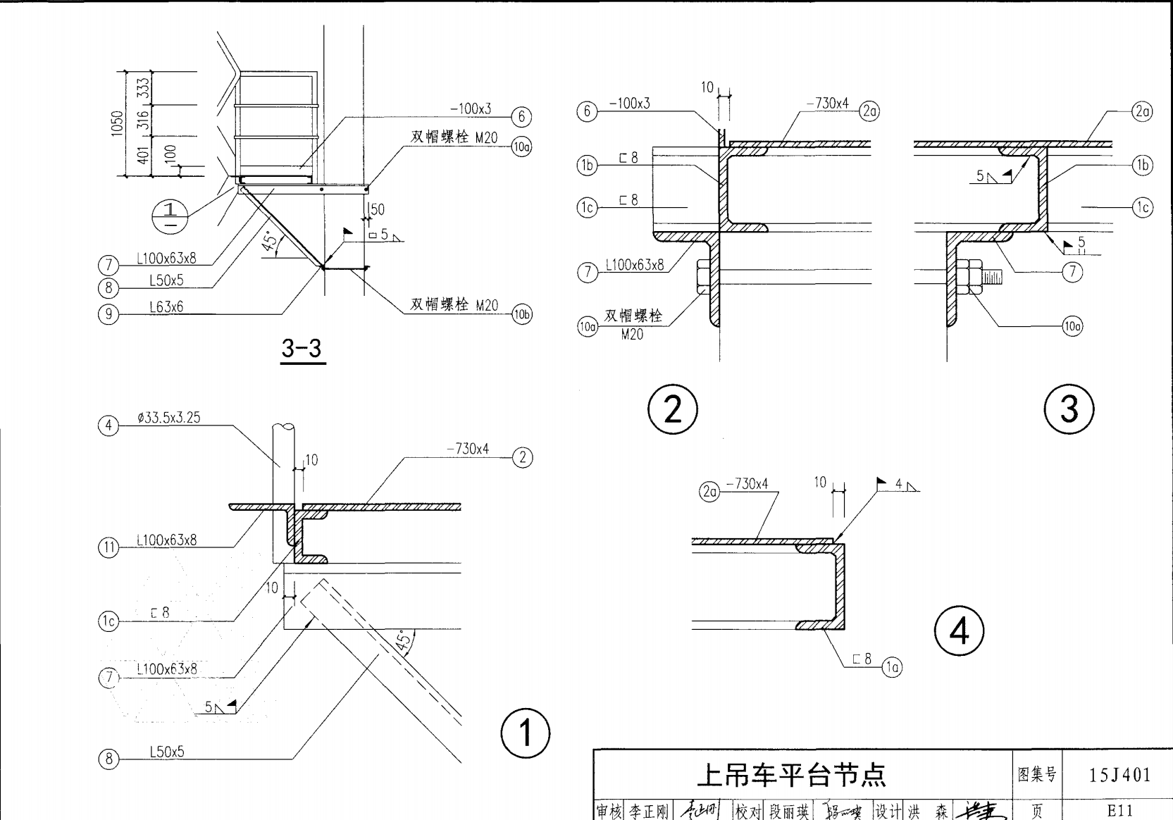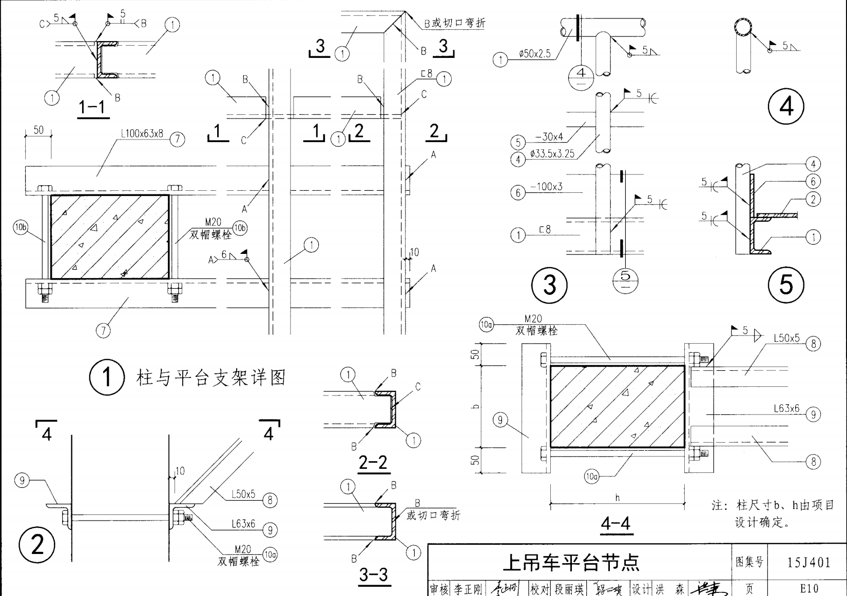 上吊車鋼斜梯由上吊車平臺、中間平臺、作業(yè)平臺鋼梯 和上端小梯組成本圖集僅做組合示意圖,不做選型編號,供項(xiàng)目設(shè)計(jì)參 考。項(xiàng)目設(shè)計(jì)時(shí)應(yīng)根據(jù)工程需要另繪簡圖咱并做選型編號,其中斜梯的梯段可從本圖集的作業(yè)平臺鋼梯部分選用按上吊車鋼斜梯在廠房中的平面布置可分為柱中式、柱 邊式及繞柱式三種形式柱中式和柱邊式推薦采用傾角為 59 梁梁底標(biāo)高小子等于。的鋼斜梯。當(dāng)?shù)踯?/spanyes';font-size:10pt;font-family:hiddenhorzocr;color:rgb(0,0,0);"> 11. OOm 梁底標(biāo)高大于時(shí),可選擇兩個(gè)梯段;當(dāng)?shù)踯嚵?/spanyes';font-size:9.9943pt;font-family:hiddenhorzocr;color:rgb(0,0,0);"> 11. OOm 時(shí),可選擇三個(gè)梯段 繞柱式推薦采用兩種傾角( 7 。和 59° )的鋼斜梯 用傾角 時(shí),可選擇兩個(gè)梯段;當(dāng)?shù)踯嚵毫旱讟?biāo)高大于3° 鋼斜梯。當(dāng)?shù)踯嚵毫旱讟?biāo)高小于等于 11. 00 11. 選擇三個(gè)梯段OOrn 時(shí),可 用傾角”。鋼斜梯。當(dāng)?shù)踯嚵毫旱讟?biāo)高小于等于 時(shí),可選擇兩個(gè)梯段;當(dāng)?shù)踯嚵毫旱讟?biāo)高大于7. 40m 7. 用多梯段40m 時(shí),可采 上吊車駕駛室的上端小梯,本圖集提供 1080mm540mm 810mm 三種高度,項(xiàng)目設(shè)計(jì)可根據(jù)吊車駕駛室的實(shí)際位置和 高度選擇上端小梯或自行設(shè)計(jì)根據(jù)項(xiàng)目設(shè)計(jì)需要,設(shè)計(jì)人可在車間的山墻上設(shè)置吊車 檢修鋼平臺鋼斜梯的涂裝要求為熱鍍鋅,可選噴漆顏色可選